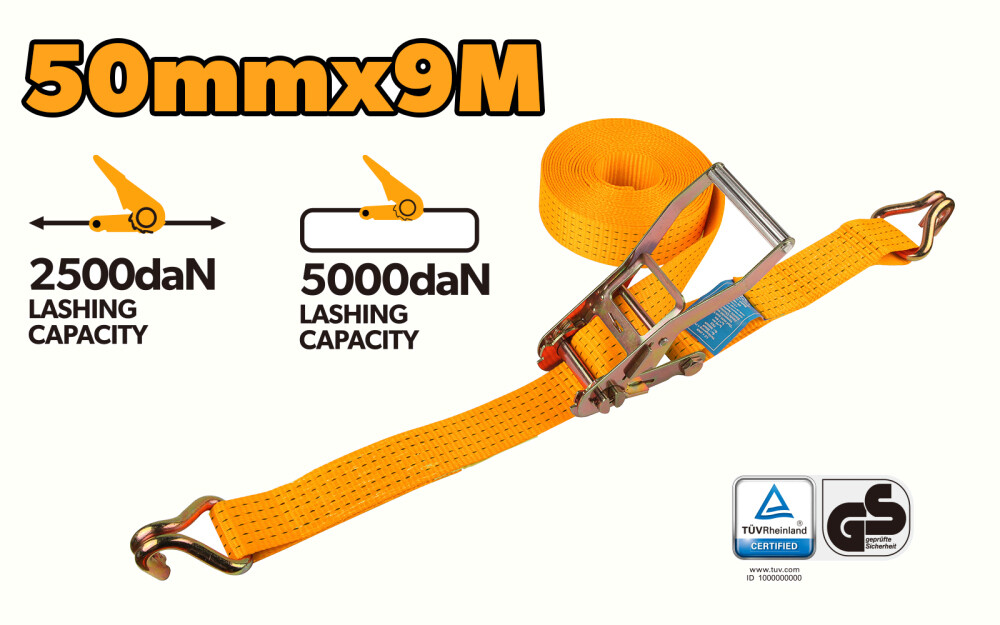 Aceasta banda cu clichet si carlige duble are o latime de 50 mm si o lungime de 9 m, ceea ce o face potrivita pentru a fixa si a lega obiecte cu usurinta. Capacitatea de prindere de pana la 2500 daN garanteaza o prindere sigura si stabila.