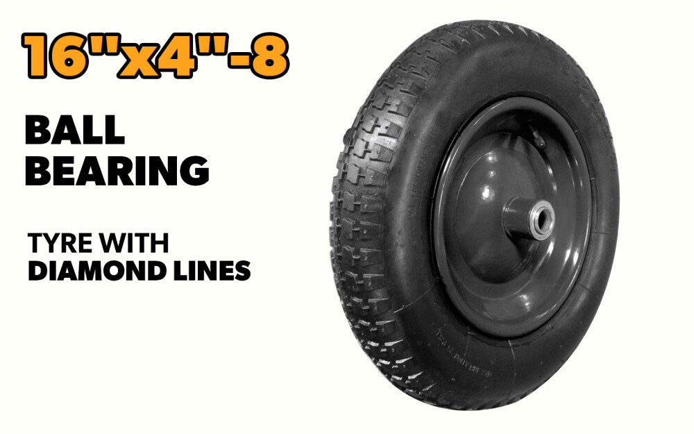 Aceasta roata pneumatica are dimensiunea de 16""x4""-8 si are o anvelopa cu linii de diamant pentru o aderenta mai buna pe teren. Este echipata cu un rulment cu bile, ceea ce face rotatia usoara si fluida.