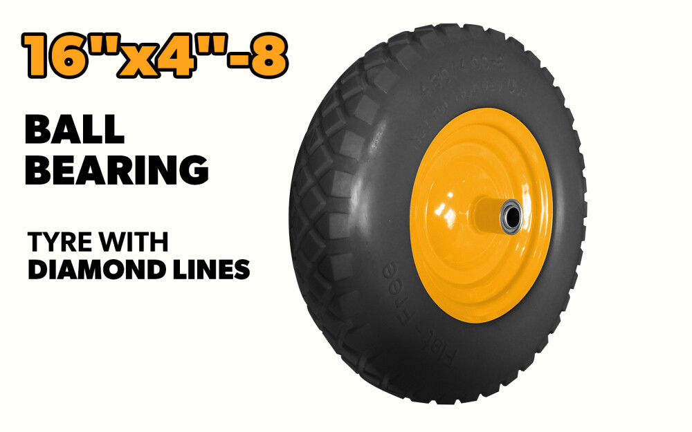 Aceasta roata are dimensiunea de 16""x4""-8 si este echipata cu un rulment cu bile pentru o rotatie usoara si fluida. Este potrivita pentru utilizarea pe orice teren si are o prindere buna, fiind perfecta pentru aplicatiile industriale sau comerciale.
