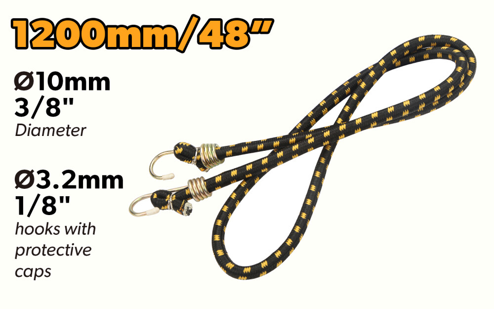 Aceasta sfoara are o lungime de 1200 mm sau 48 inci si un diametru de 10 mm sau 3/8 inci, ceea ce o face potrivita pentru a fixa si a lega obiecte de dimensiuni mai mari. Carligele de 3,2 mm sau 1/8 inci cu capace de protectie asigura o prindere sigura si stabila.