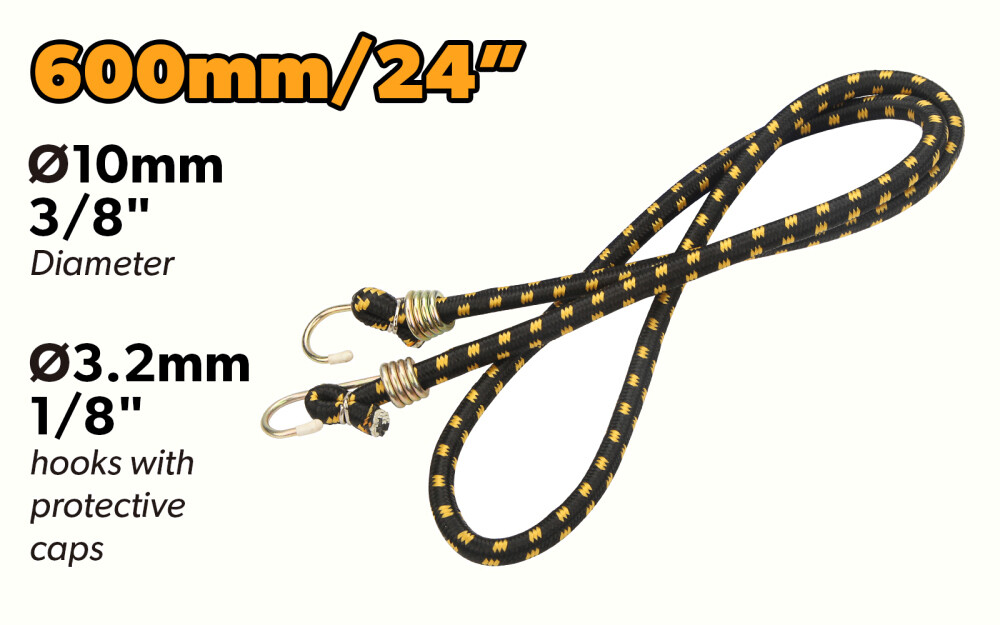 Aceasta sfoara are o lungime de 600 mm sau 24 inci si un diametru de 10 mm sau 3/8 inci, ceea ce o face potrivita pentru a fixa si a lega obiecte de dimensiuni mai mici si medii. Carligele de 3,2 mm sau 1/8 inci cu capace de protectie asigura o prindere sigura si stabila.