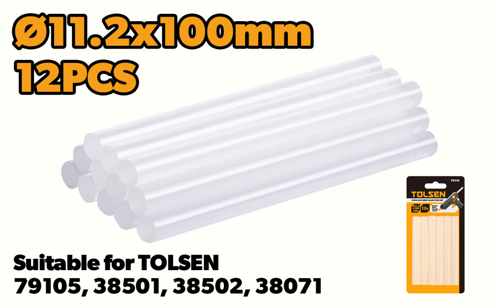 Batoanele de adeziv Tolsen au dimensiunea de 11,2x100 mm și sunt ambalate într-un set de 12 bucăți. Acest lucru asigură că aveți suficiente batoane pentru a termina proiectul de lipire fără a fi nevoie să cumpărați mai multe bucăți în timpul lucrului.