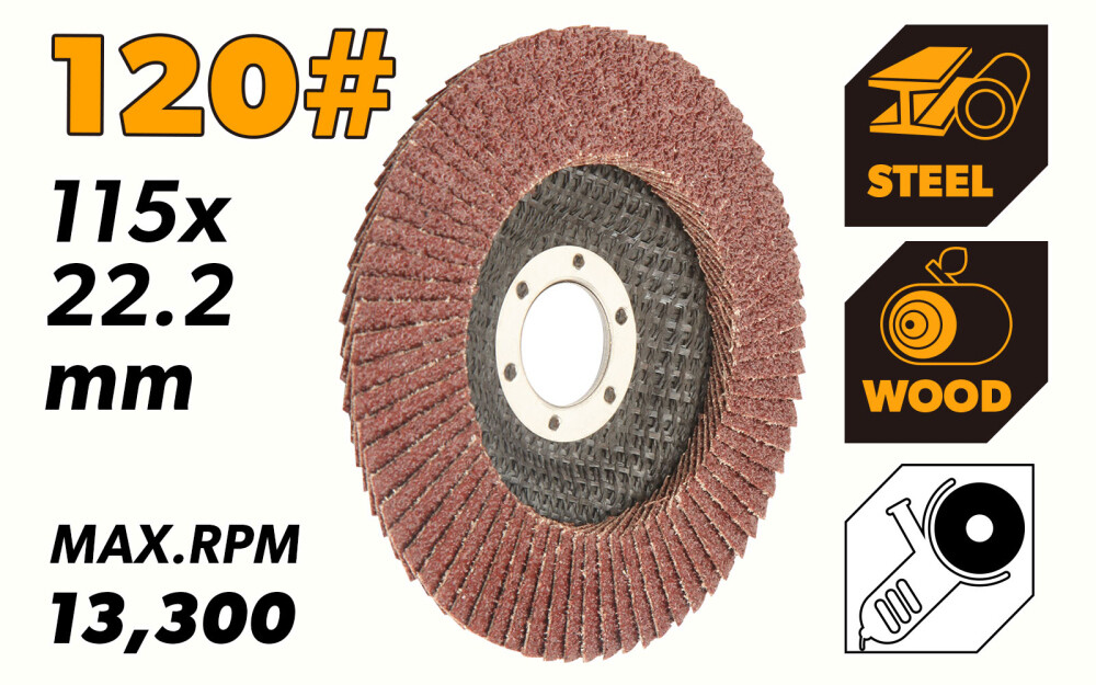 Disc abraziv lamelar din oxid de aluminiu (Intaritura din fibre), 115x22,2 mm 120# - Tolsen