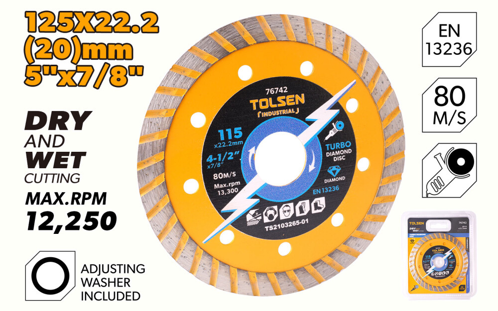 Acest disc de taiere diamantat are o dimensiune de 125x22.2 mm si o latime a lamei de 10 mm, ceea ce il face ideal pentru o varietate de aplicatii de taiere. Discul este proiectat pentru a oferi o performanta de taiere precisa si rapida, datorita tehnologiei Turbo. Cu o viteza maxima de 12.250 RPM, acest disc poate fi folosit cu incredere in aplicatii de taiere intensive.