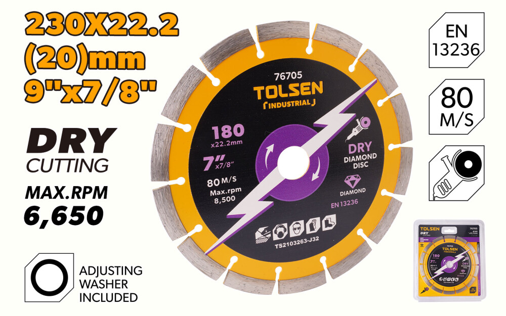 Acest disc de taiere diamantat de la Tolsen este conceput pentru a oferi o performanta superioara in timpul operatiunilor de taiere si pentru a fi utilizat in aplicatii industriale si comerciale. Cu o latime de 10 mm si o dimensiune de 230x22.2 mm, acest disc este perfect pentru o varietate de aplicatii de taiere.