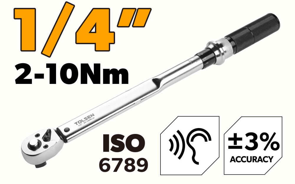 Dimensiune: 1/4 "Interval de cuplu: 2-10N.m. În conformitate cu DIN EN ISO 6789 Tolerantă de precizie de eliberare ± 3% din valoarea scalei Reversibil cu actionare pătrată și functie integrată cu clichet reversibil pentru schimbarea manetei pentru strangere controlată în sensul acelor de ceasornic Semnal de eliberare cand valoarea este atinsă Structura tubului de oblat din otel crom-molibden face o sectiune transversală mică și mai ușor de utilizat în spatiu îngust Ambalare: cutie de culoare