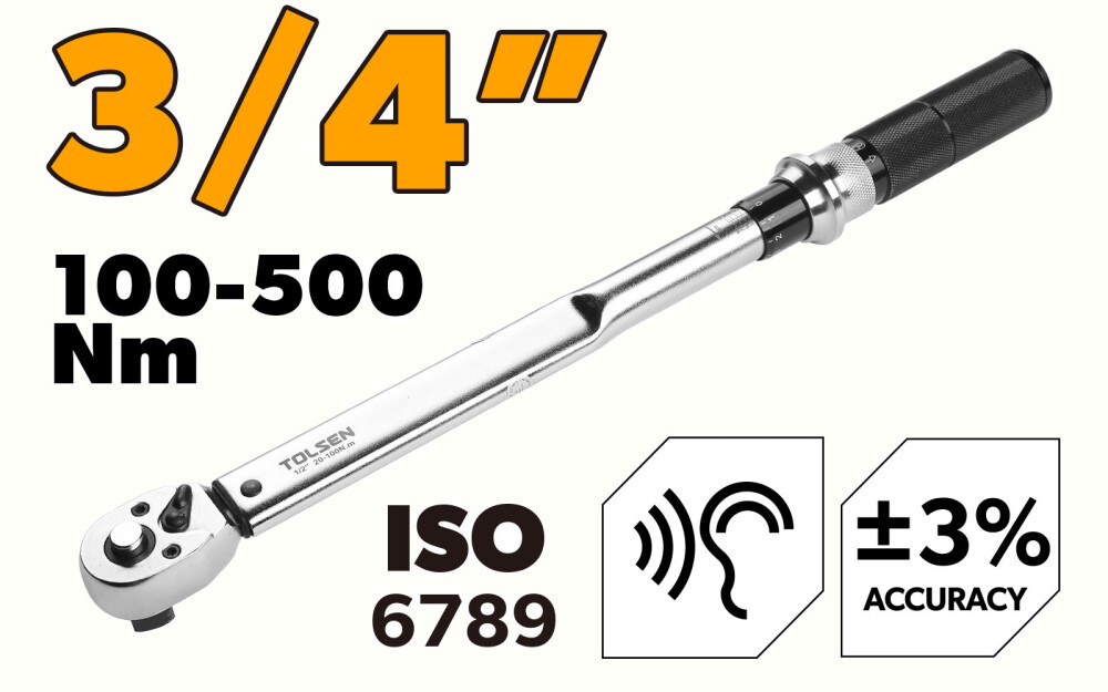 Dimensiune: 3/4 "Interval de cuplu: 100-500N.m. În conformitate cu DIN EN ISO 6789 Tolerantă de precizie de eliberare ± 3% din valoarea scalei Reversibil cu actionare pătrată și functie integrată cu clichet reversibil pentru schimbarea manetei pentru strangere controlată în sensul acelor de ceasornic Semnal de eliberare cand valoarea este atinsă Structura tubului de oblat din otel crom-molibden face o sectiune mică și mai ușor de utilizat în spatiu îngust Ambalare: cutie de culoare