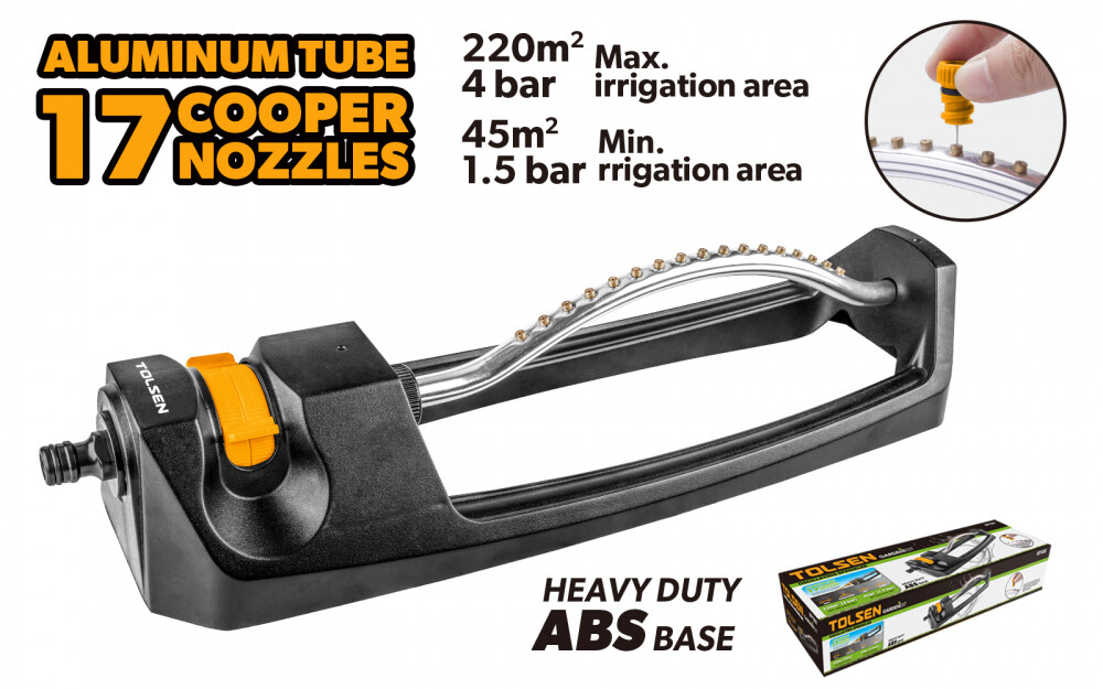Sprinkler Oscilant cu Tub din Aluminiu, 17 Duze din Alama, Baza din ABS, Gama de Irigare 45m² - 220m², TOLSEN