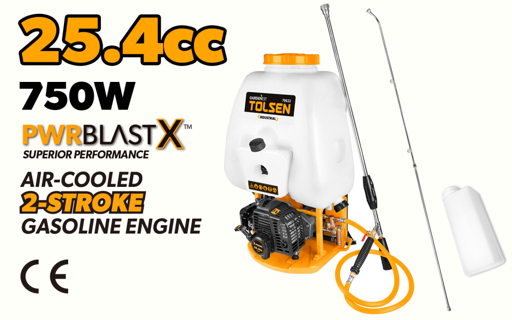Motorul cu 2 timpi tip TU26, alimentat cu un amestec de benzina 25:1, asigura o putere constanta si o aprindere electronica sigura. Cu o capacitate de motor de 25.6 cmc si o racire cu aer, atomizorul TOLSEN este proiectat pentru performanta maxima.