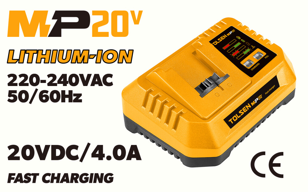 Cu incarcatorul rapid de 20VDC/4.0A MP20V de la Tolsen, puteti incarca rapid si eficient bateria sculelor dumneavoastra fara fir. Acest incarcator este compatibil cu bateria TOLSEN 20V 4.0Ah 87474 si este ideal pentru a incarca aceasta baterie intr-un timp scurt de doar 60 de minute.