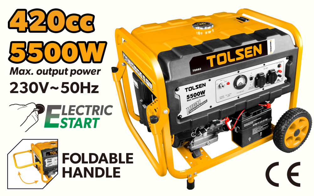 Generatorul electric pe benzină Tolsen este o sursă de energie excelentă și fiabilă, furnizând o putere de ieșire nominală de 5000W și o putere maximă de 5500W. Acesta este omologat CE și are o tensiune nominală de 220V și o frecvență de 50Hz.