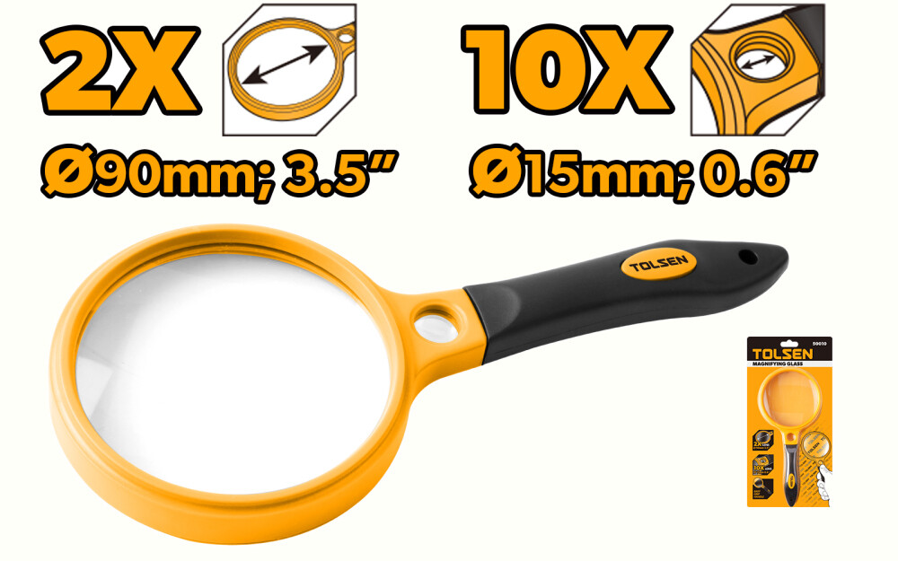 Alege lupa cu maner din cauciuc cu 2 lentile 2X, 15mm si 2X, 90mm de la Tolsen - o unealta practica si versatila, perfecta pentru a-ti ajuta la lucrul cu obiecte mici si detalii fine.