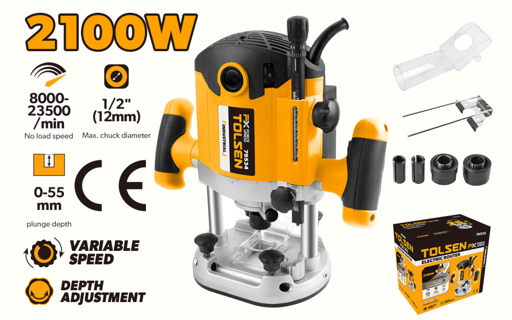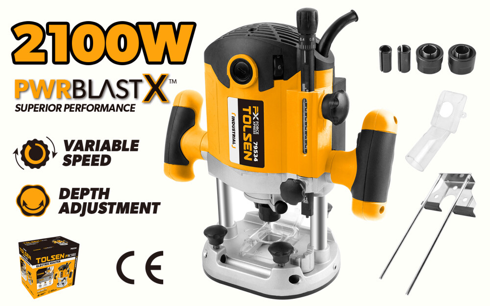 Freza electrică Tolsen este un instrument puternic și durabil, cu un motor de performanță superioară PwrBlastX. Cu o putere de intrare de 2100W și o tensiune nominală de 220-240V, frecvența de 50/60Hz și o viteză fără încărcare variabilă de la 8000 la 23500r/min, acest instrument vă oferă puterea și performanța de care aveți nevoie pentru a prelucra lemnul cu ușurință și precizie.