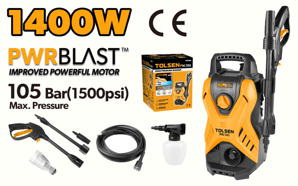 Aparatul de spălat cu presiune Tolsen este dotat cu un motor PwrBlastX performant, ce garantează o performanță superioară și o eficiență ridicată în curățarea rapidă și eficientă a suprafețelor murdare de la mașini, mobilier de grădină, trotuare și alte suprafețe similare. Acesta are o putere de intrare de 1400W și o tensiune nominală de 230V, frecvența de 50Hz și o presiune nominală de 70Bar (1000psi) și o presiune maximă de 105Bar (1500psi). Acesta are o rată de curgere de 5L/min și funcția de aspirație automată.