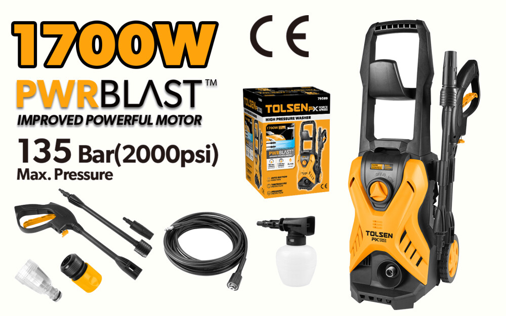 Aparatul de spălat cu presiune Tolsen este dotat cu un motor PwrBlastX performant, ce garantează o performanță superioară și o eficiență ridicată în curățarea rapidă și eficientă a suprafețelor murdare de la mașini, mobilier de grădină, trotuare și alte suprafețe similare. Acesta are o putere de intrare de 1700W și o tensiune nominală de 230V, frecvența de 50Hz și o presiune nominală de 90Bar (1300psi) și o presiune maximă de 135Bar (2000psi). Acesta are o rată de curgere de 5L/min și funcția de aspirație automată.
