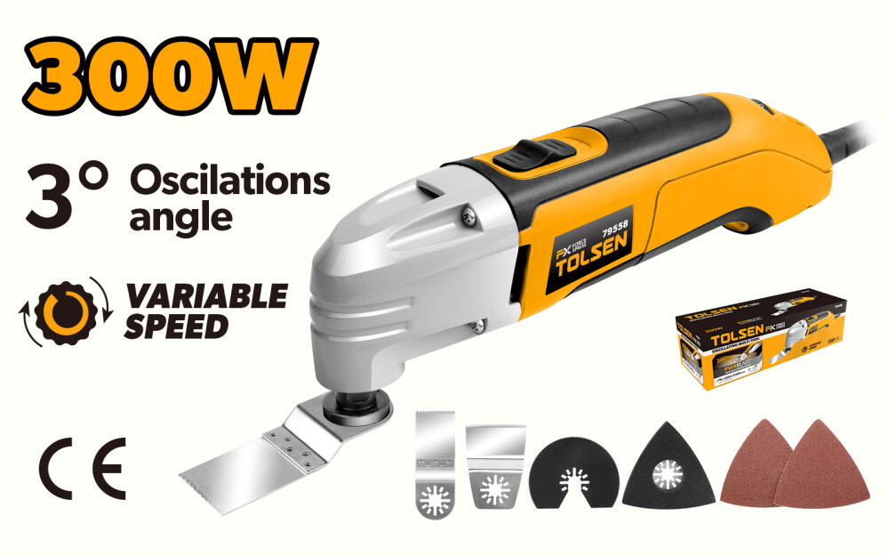 Această unealtă Tolsen este un multifuncțional cu o putere de 300W și tensiune nominală de 230-240V, frecvența de 50Hz și o viteză fără încărcare între 15000-22000 opm. Acest set include o varietate de accesorii pentru a vă ajuta să faceți o varietate de proiecte de prelucrare, inclusiv o lamă plată pentru zgâriere, o lamă universală, o placă de șlefuit triunghiulară, o lamă de ferăstrău semicirculară și 2 coli de șlefuit triunghiulare (80,120 granulații).