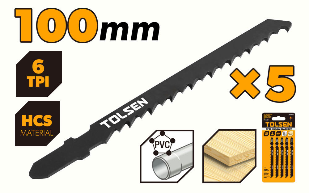 Aceste 5 lame de ferastraie T144D Tolsen sunt ideale pentru taierea rapida si precisa a lemnului, placilor aglomerate, placajelor, scandurilor si plasticului. Lamele sunt construite din material HCS si au un design T-Shank pentru o prindere sigura si stabila.