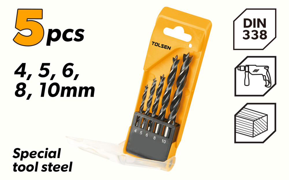 Acest set de 5 burghie pentru lemn Tolsen este ideal pentru utilizarea la domiciliu sau in mediul industrial. Fabricate din otel carbon de inalta calitate conform standardului DIN338 si cu un finisaj negru cu suprafata polisata, aceste burghie sunt durabile si pot fi folosite cu usurinta pe o varietate de materiale din lemn.