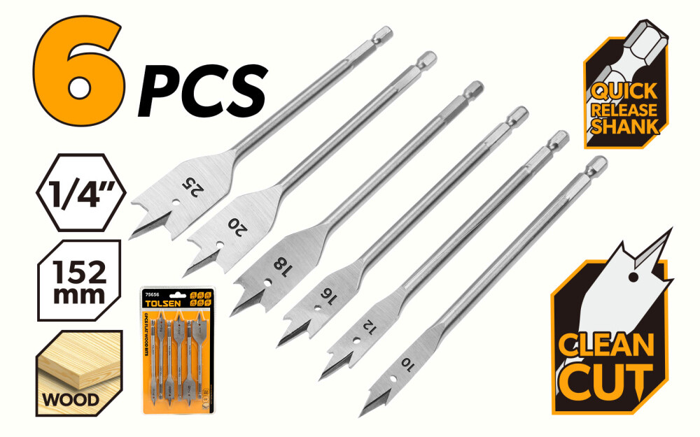 Acest set de 6 bucati biti pentru lemn Tolsen sunt fabricate din otel carbon, au fost tratate termic si polisate cu precizie pentru a va oferi cea mai buna performanta. Fiecare bit are un shank hexagonal cu eliberare rapida de 1/4" pentru a se potrivi cu usurinta cu majoritatea masinilor de gaurit.