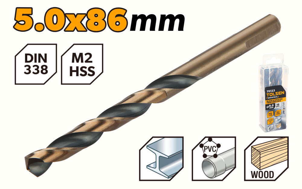 Aceste burghie Tolsen sunt fabricate din otel HSS/M2, conform standardului DIN338, si sunt ideale pentru utilizarea in aplicatii industriale. Caracteristica distinctiva a acestor burghie este faptul ca au un varf aurit si caneluri negre, ceea ce le confera un aspect atractiv.