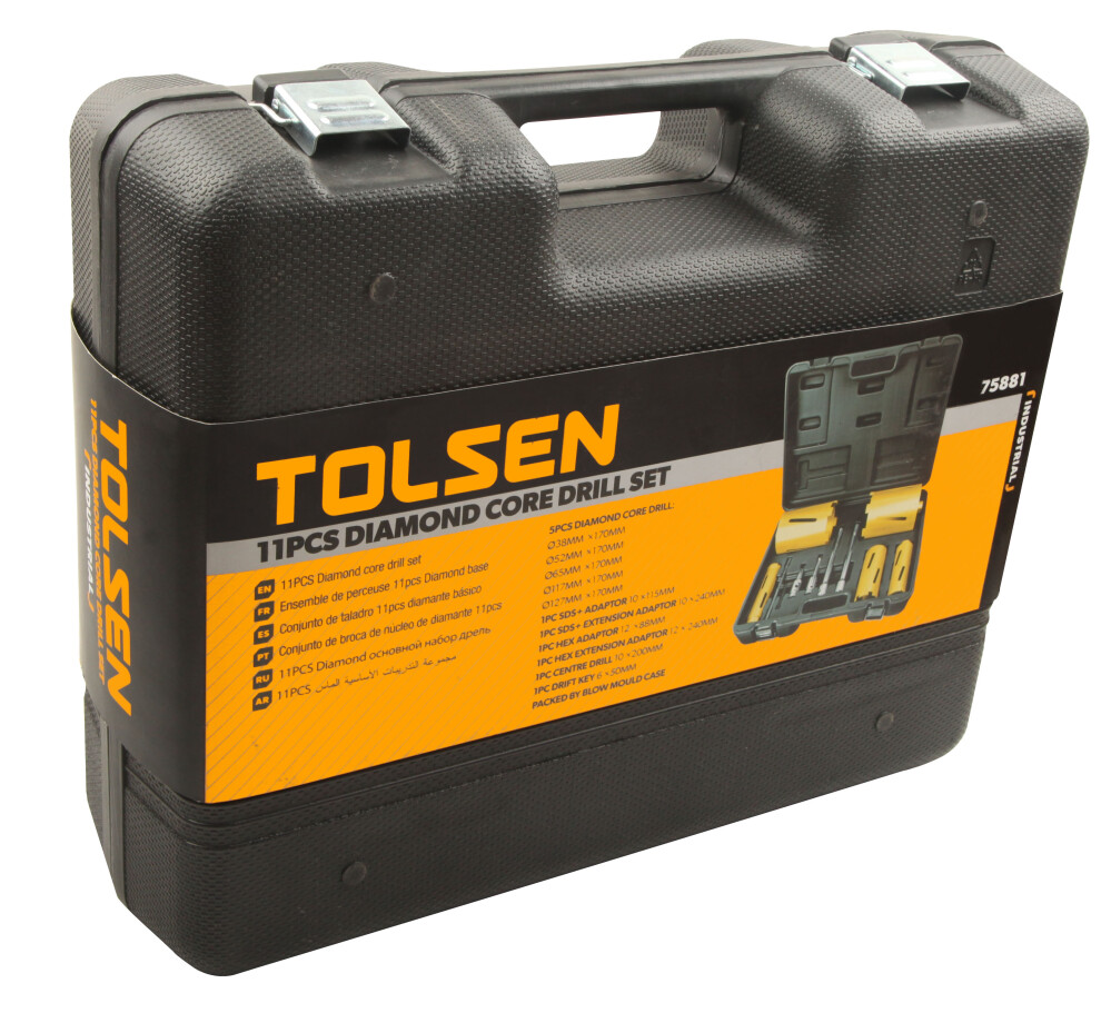 Acest set de 11 carote de baza diamantate Tolsen este conceput pentru a taia gauri de diverse dimensiuni in beton si alte materiale dure. Setul contine cinci carote de dimensiuni diferite, un adaptor SDS+ de 115mm, un adaptor de prelungire SDS+ de 240mm, un adaptor hexagonal de 12 x 88mm, un adaptor de prelungire hexagonal de 12 x 240mm, un burghiu central de 10 x 200mm si o cheie de drift de 6 x 50mm.