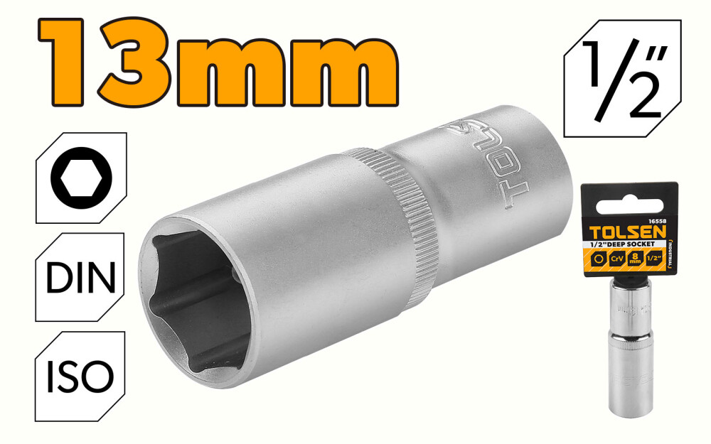 Cheie tubulara lunga de 1/2" Cr-V 13 mm, Industrial - Tolsen