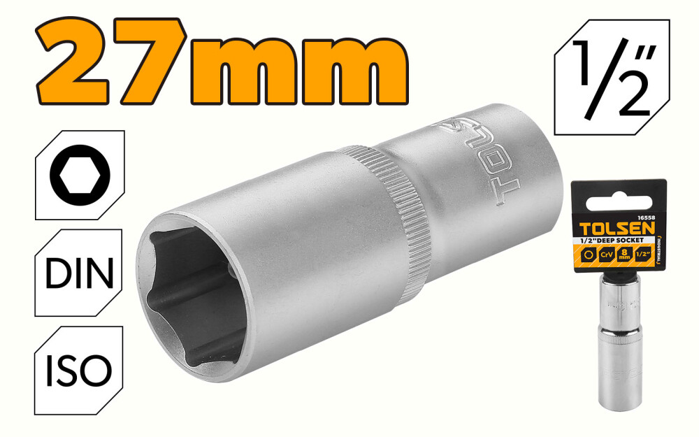 Cheie tubulara lunga de 1/2" Cr-V 27 mm, Industrial - Tolsen