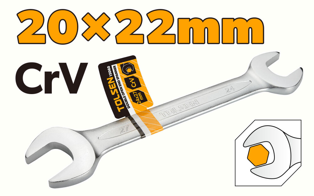 Cheia de piulite cu capat deschis dublu Tolsen este confecÈ›ionată din Cr-V - un material de calitate superioară ce oferă durabilitate È™i rezistență sporită la coroziune. De asemenea, suprafaÈ›a cromată oferă un finisaj excelent, care împiedică formarea petelor È™i a coroziunii, ceea ce face acest instrument să arate mereu bine.