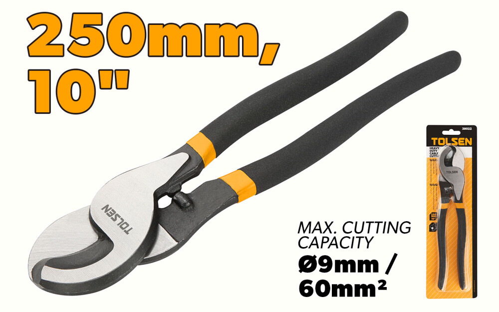 Acest cutter de cabluri heavy duty este un instrument puternic și indispensabil în orice trusă de scule, ideal pentru tăierea rapidă și precisă a cablurilor groase. Cu o dimensiune de 250 mm (10 inci), acest cutter de cabluri Tolsen este construit din oțel de înaltă calitate, forjat prin cădere pentru durabilitate și rezistență la uzură. Mânerul este acoperit cu material plastic pentru o utilizare confortabilă și sigură.