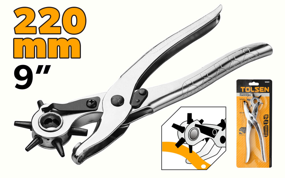 Cleste de perforare rotativ 220 mm - Tolsen Clestele de perforare rotativ Tolsen de 220 mm este un instrument durabil și ergonomic, ideal pentru a crea găuri precise în materiale dure, cum ar fi piele, lemn și plastic.