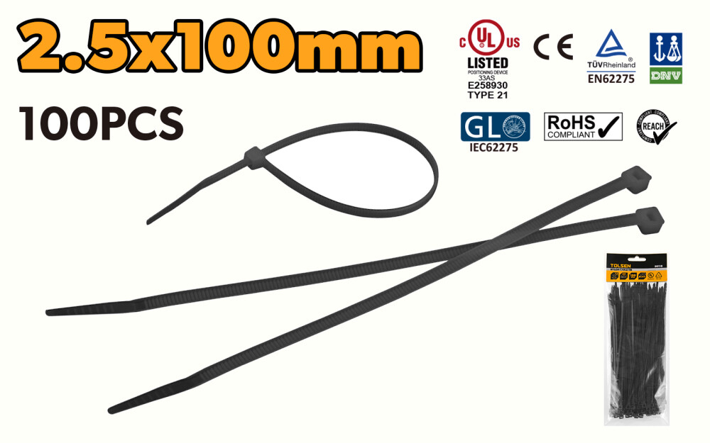 Colier din nailon pentru cabluri 2,5x100 mm negru, 100 buc, Tolsen