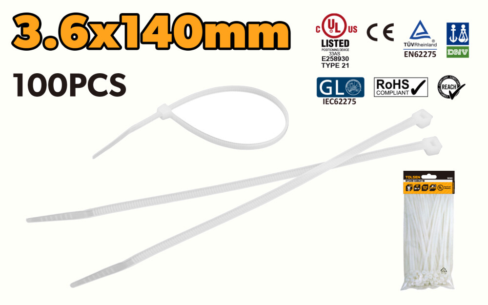 Colier din nailon pentru cabluri 3,6x140 mm alb, 100 buc - Tolsen