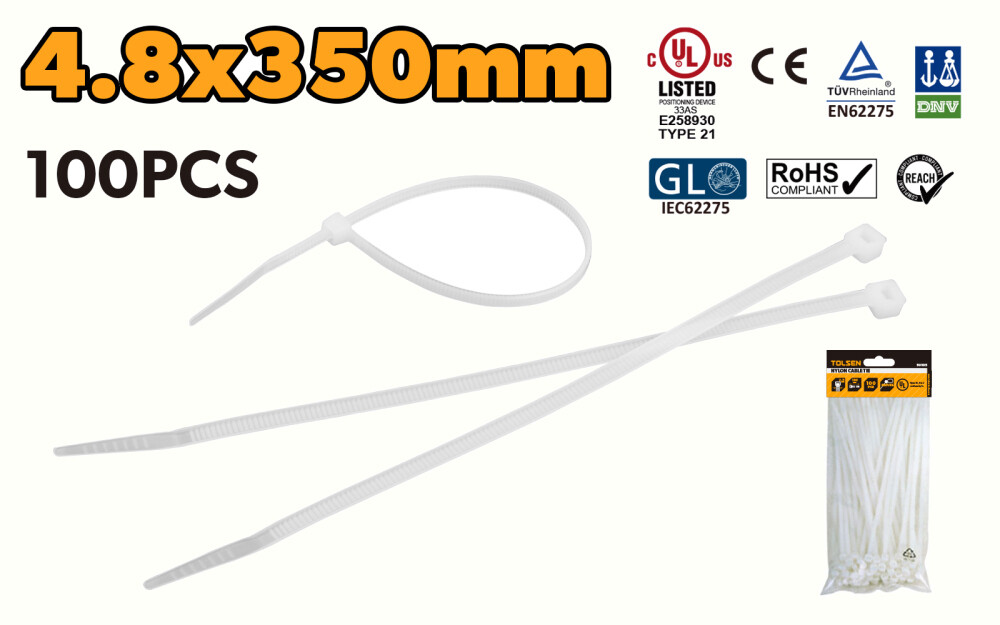 Colier din nailon pentru cabluri 4,8x350 mm alb, 100 buc, Tolsen