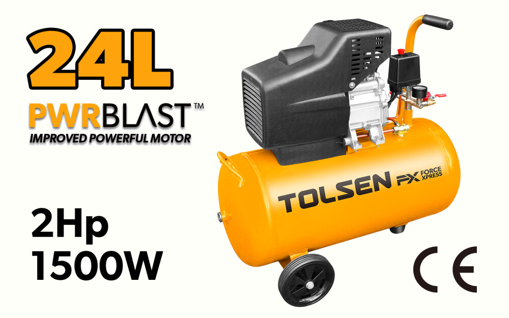 Acest compresor de aer Tolsen are o putere de intrare de 1500W / 2HP, o tensiune nominală de 220-240V și o frecvență de 50/60HZ. Compresorul are o capacitate a rezervorului de 24L și o deplasare a aerului de 188L/min. Compresorul poate atinge o presiune maximă de pompare de 8Bar (115psi) și o viteză de 2850rpm.