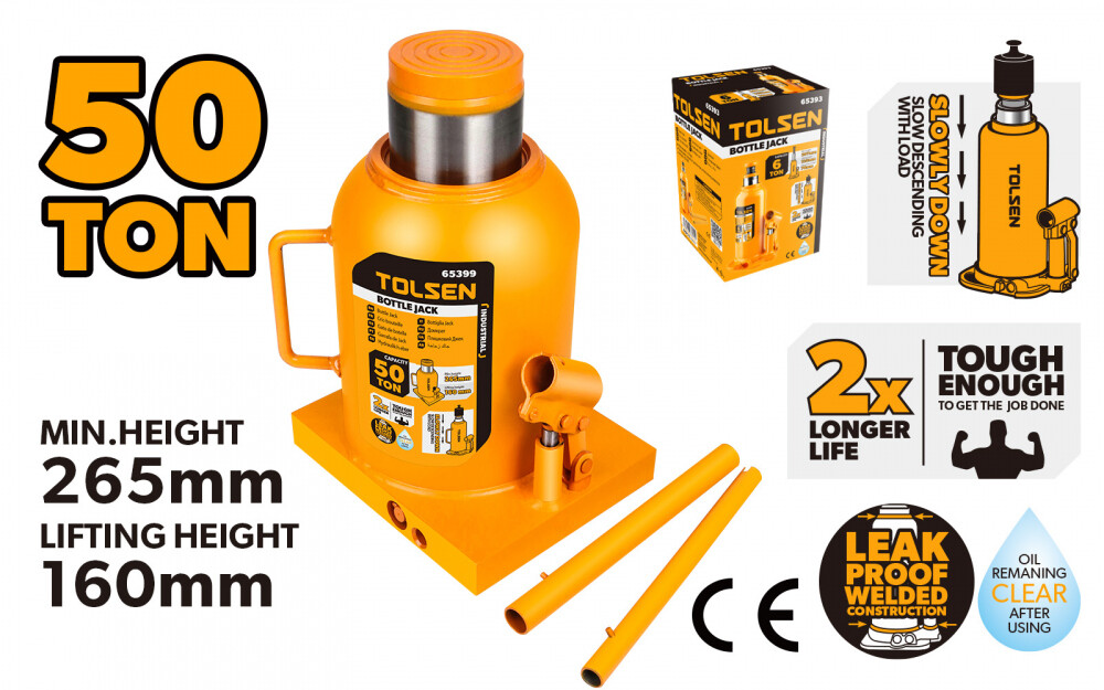 Aprobat CE Capacitate: 50 tone Înălțime minimă: 265 mm Înălțime de ridicare: 160 mm Greutate netă: 25 kg Durată de viață de 2 ori mai lungă Construcție sudată, etanșă, fără scurgeri Placă de oțel în loc de fontă pentru protecția mediului Previne scurgerile de ulei Uleiul rămâne curat după utilizare Ambalaj: cutie colorată