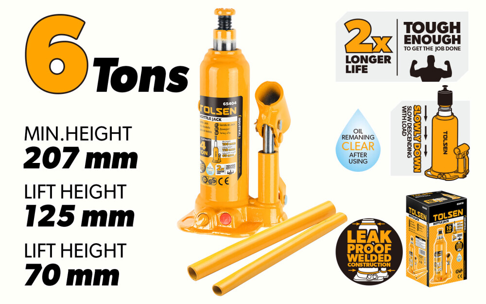Constructia sudata fara scurgeri si placa de otel in loc de fonta protejeaza mediul inconjurator, in timp ce previne scurgerile de ulei. Dupa utilizare, uleiul ramane curat, ceea ce face ca acest cric hidraulic tip butelie Tolsen sa fie o alegere excelenta pentru oricine doreste un produs de calitate superioara. Acest cric hidraulic tip butelie Tolsen este livrat intr-o cutie colorata pentru a fi perfecta pentru cadouri.