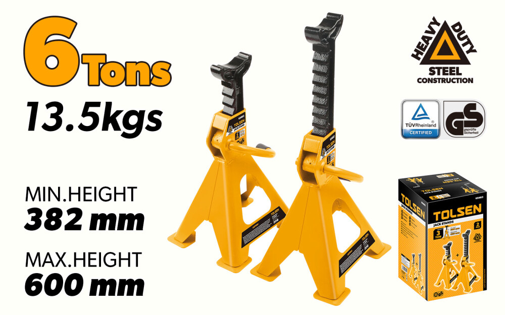Aceste suporturi pentru auto Tolsen sunt ideale pentru cei care au nevoie de un set de suporturi pentru masini mai mari, cu o capacitate de sustinere de pana la 6 tone. Suporturile sunt realizate cu un mecanism de prindere cu cremaliera si manere solide din otel, care asigura o fixare sigura si stabila sub masina. Aceste suporturi pentru auto au o inaltime minima de 382 mm si o inaltime maxima de 600 mm, ceea ce le face ideale pentru o gama larga de autovehicule. De asemenea, au o greutate neta de 13.5 kg.