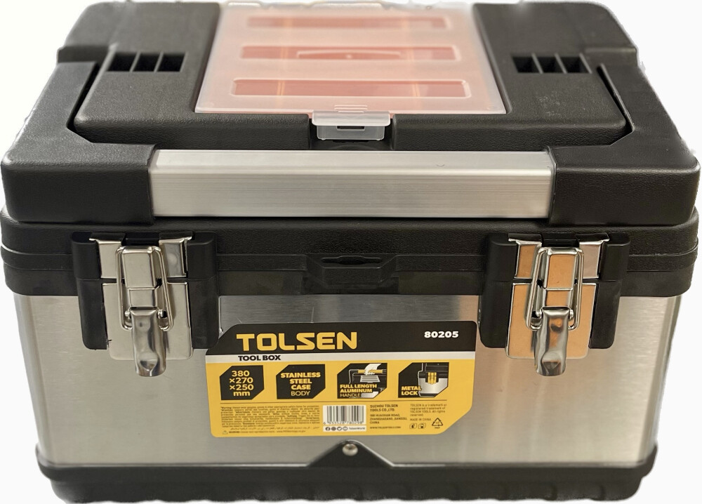 Capac din oțel inoxidabil Corp din plastic armat. Mâner din aliaj de aluminiu și catarame din oțel (cu tavă) 38x27x25 cm.