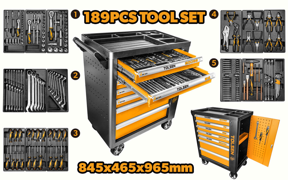 Dulap mobil cu set scule, 7 sertare, 10 seturi scule, set de 189 de scule 845x465x965mm - Tolsen