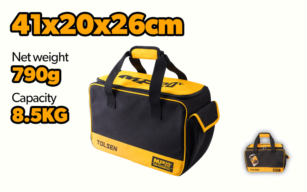 Geanta pentru pentru unelte Conceput pentru MP20V serie de scule - Tolsen este ideala pentru a va pastra uneltele organizate si in siguranta. Cu dimensiunile de 41x20x26cm si o greutate neta de 790g, aceasta geanta are o capacitate de incarcare de 8.5kg, permițandu-va sa depozitati o varietate de instrumente.