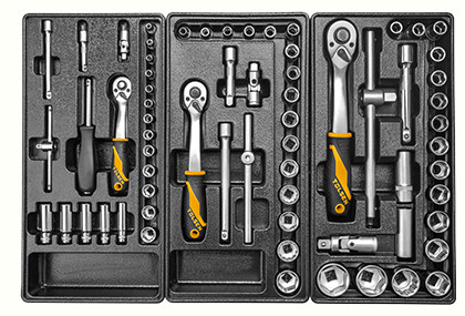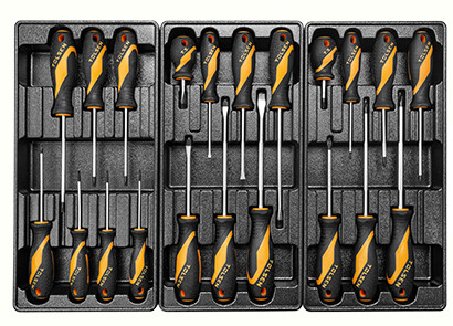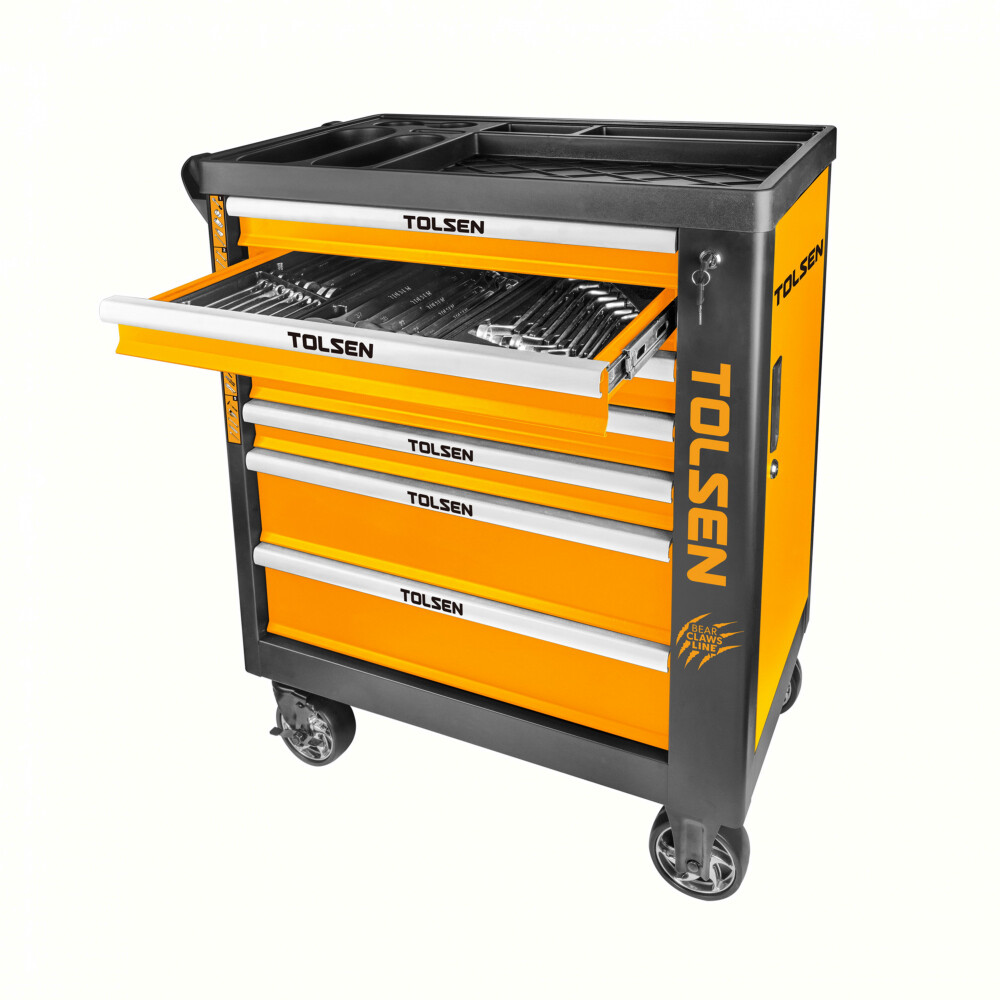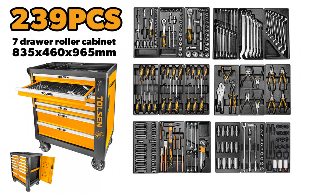 Conținutul setului de scule Tăvița 1: Tubulare 1/2" și accesorii 16 tubulare 1/2" (6 colțuri): 10, 11, 12, 13, 14, 15, 16, 17, 18, 19, 21, 22, 24, 27, 30, 32 mm 2 tubulare 1/2" pentru bujii: 14, 16 mm 1 prelungitor 1/2" 125 mm 1 bară glisantă 1/2" 250 mm 1 articulație universală 1/2" 1 mâner clichet 1/2" 14 tubulare adânci 1/2" (6 colțuri): 10, 12, 13, 14, 15, 16, 17, 18, 19, 21, 22, 24, 27, 30 mm Mâner flexibil 1/2" 15" (375 mm) Mâner în formă de L 1/2" 260 mm Prelungitoare 1/2": 10" (250 mm), 3" (75 mm), prelungitor offset Tubulare E tip 1/2": E8, E10, E11, E12, E14, E16, E18, E20, E22, E24 Tăvița 2: Tubulare 1/4" și 3/8" și accesorii pentru impact 13 tubulare 1/4" (6 colțuri): 4, 4.5, 5, 5.5, 6, 7, 8, 9, 10, 11, 12, 13, 14 mm 5 tubulare adânci 1/4" (12 colțuri): 8, 10, 11, 12, 13 mm 1 mâner clichet 1/4" 2 prelungitoare 1/4": 50 mm, 100 mm 1 bară glisantă 1/4" 115 mm 1 articulație universală 1/4" 1 mâner spinner 1/4" 150 mm 16 tubulare 3/8" (6 colțuri): 6, 7, 8, 9, 10, 11, 12, 13, 14, 15, 16, 17, 18, 19, 21, 22 mm 2 prelungitoare 3/8": 75 mm, 150 mm 1 bară glisantă 3/8" 160 mm 1 articulație universală 3/8" 1 mâner clichet 3/8" Prelungitoare impact 1/2": 3" (75 mm), 5" (125 mm), 10" (250 mm) Articulație universală impact 1/2" Tubulare impact cu protecție PP: 17, 19, 21 mm 14 tubulare impact 1/2": 10, 12, 13, 14, 15, 16, 17, 18, 19, 21, 22, 24, 27, 30 mm Tăvița 3: Chei fixe combinate și duble inel 14 chei fixe combinate: 6 până la 19 mm 6 chei fixe combinate: 21, 22, 24, 27, 30, 32 mm 7 chei duble inel: 6x7, 8x9, 10x11, 12x13, 14x15, 16x17, 18x19 mm Tăvița 4: Set șurubelnițe 7 șurubelnițe cu cap drept: SL3x75, SL5x100, SL5x150, SL6x38, SL6x100, SL6x150, SL8x150 mm 7 șurubelnițe Phillips: PH0x100, PH1x75, PH1x100, PH2x38, PH2x100, PH2x150, PH3x150 mm 7 șurubelnițe Torx cu orificiu: T8Hx75, T10Hx75, T15Hx75, T20Hx100, T25Hx100, T27Hx100, T30Hx125 mm Tăvița 5: Clești Clește reglabili 250 mm Clește cu blocare 250 mm Clește mini cu bot lung 115 mm Clești pentru circlip interior (drepți și îndoiți) 180 mm (2 bucăți fiecare) Clești pentru circlip exterior (drepți și îndoiți) 180 mm (2 bucăți fiecare) Clește combinați 180 mm Clește cu bot lung 160 mm Clește cu bot îndoit 160 mm Clește tăietori diagonali 160 mm Tăvița 6: Accesorii, cuie, dălți și ciocan Cuplaje: 1/2"×3/8", 3/8"×3/8", Cr-V Biți 30 mm Cr-V (19 buc): Hex (H4-H12), Multi-spline (M5-M12), Torx (T20-T55) Biți 75 mm Cr-V (19 buc): Hex (H4-H12), Multi-spline (M5-M12), Torx (T20-T55) Cuie ghidaj: 3, 4, 5, 6 mm Ciocan centru 4 mm × 120 mm Dălți: 16 mm × 170 mm, 24 mm × 220 mm Ciocan de mecanic 500 g Set chei hexagonale cu bilă (9 buc): 1.5 până la 10 mm Chei pentru furtunuri (6 buc): 8x10, 10x12, 11x13, 12x14, 17x19, 19x22 mm Dulap rulant cu 7 sertare Corp și sertare finisaj negru mat Sudură internă pentru durabilitate crescută Capacitate încărcare sertar: 35 kg Sistem de blocare rapidă Tavă/bazin lateral multifuncțional Roți 5" (2 fixe, 2 pivotante) Dimensiuni totale (ÎxLxA): 760 x 458 x 970 mm Ambalare: Cutie carton pe palet pentru transport sigur