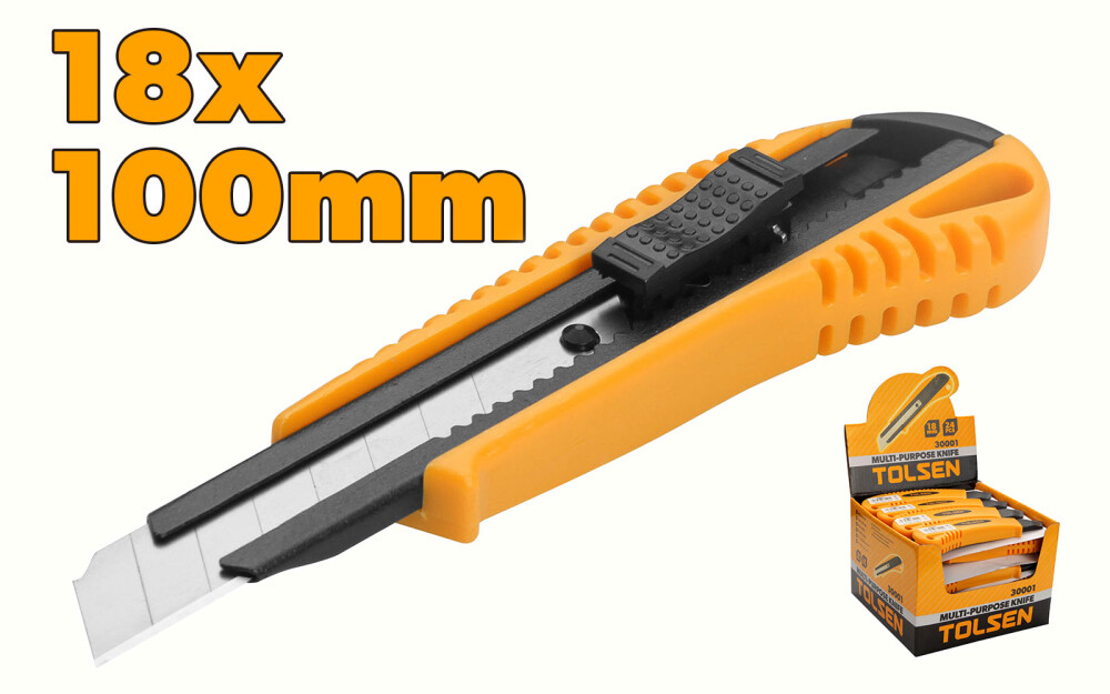 Cutterul cu lama cu clic Tolsen de 18x100 mm cu carcasa din plastic ABS este alegerea perfectă pentru a-ți ușura munca în diverse proiecte de bricolaj sau în construcții. Cu o lamă ascuțită și un mâner ergonomic cu buton plat, acest cutter este perfect pentru tăierea rapidă și precisă a materialelor de diferite densități și grosimi. Carcasa din plastic ABS oferă o protecție excelentă împotriva uzurii și a coroziunii, ceea ce face acest cutter un instrument durabil și de încredere. Ambalat cu etichetă și cutie de prezentare, acest cutter este perfect pentru a fi expus în magazine sau depozite și poate fi ușor de identificat.