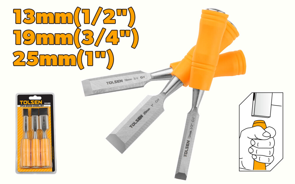 Aceasta dalta pentru lemn Tolsen vine intr-un set de 3 bucati cu marimile de 13mm(1/2")-19mm(3/4")-25mm(1"). Aceasta este perfecta pentru taieri precise si de inalta calitate in lemn si alte materiale lemnoase. Lama din CrV este durabila si va tine mult timp, indiferent de cat de des o utilizati. Manerul din plastic PP este confortabil si ergonomic, asigurand o priza sigura si antialunecare. Acest set de dalte vine ambalat intr-un blister dublu pentru o protectie suplimentara si o depozitare usoara.