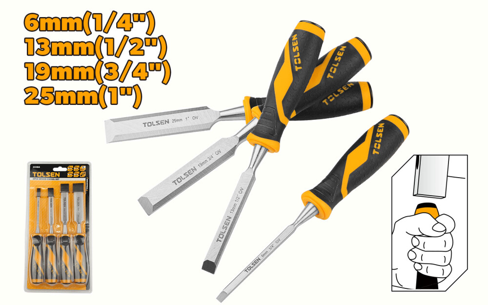 Aceasta dalta pentru lemn Tolsen vine intr-un set de 4 bucati cu marimile de 6mm(1/4"")-13mm(1/2"")-19mm(3/4"")-25mm(1""). Aceasta este un produs industrial, perfect pentru profesionistii care au nevoie de scule de inalta calitate pentru a efectua sarcinile de taiere in mod eficient si precis. Lama din CrV este durabila si rezistenta la uzura, fiind ideala pentru o utilizare frecventa si indelungata. Manerul din plastic cu doua componente este proiectat pentru a oferi confort si siguranta in timpul utilizarii. Acest set de dalte vine ambalat intr-un blister dublu pentru a asigura protectie suplimentara si depozitare usoara.
