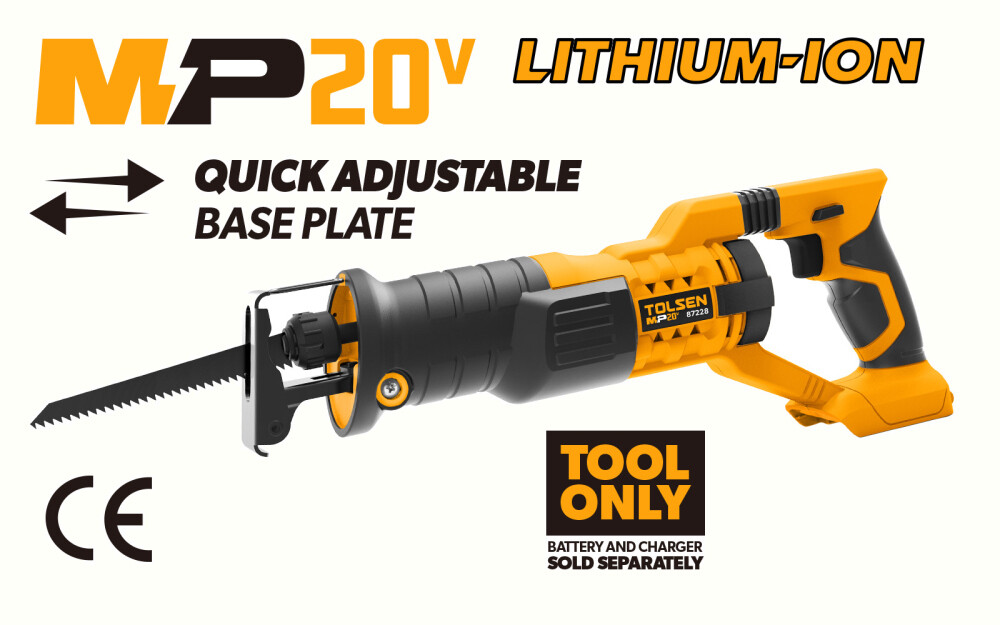 Acest ferastrau sabie fara fir utilizeaza o baterie Li-ion de 20V pentru a asigura o functionare fara fir, fara a fi nevoie sa utilizati cabluri sau alimentare electrica. Acesta nu include bateria, insa este compatibil cu toate acumulatorii Li-ion Tolsen MP20V, ceea ce inseamna ca puteti utiliza bateria existenta pentru a economisi bani si pentru a maximiza utilizarea acumulatorilor.