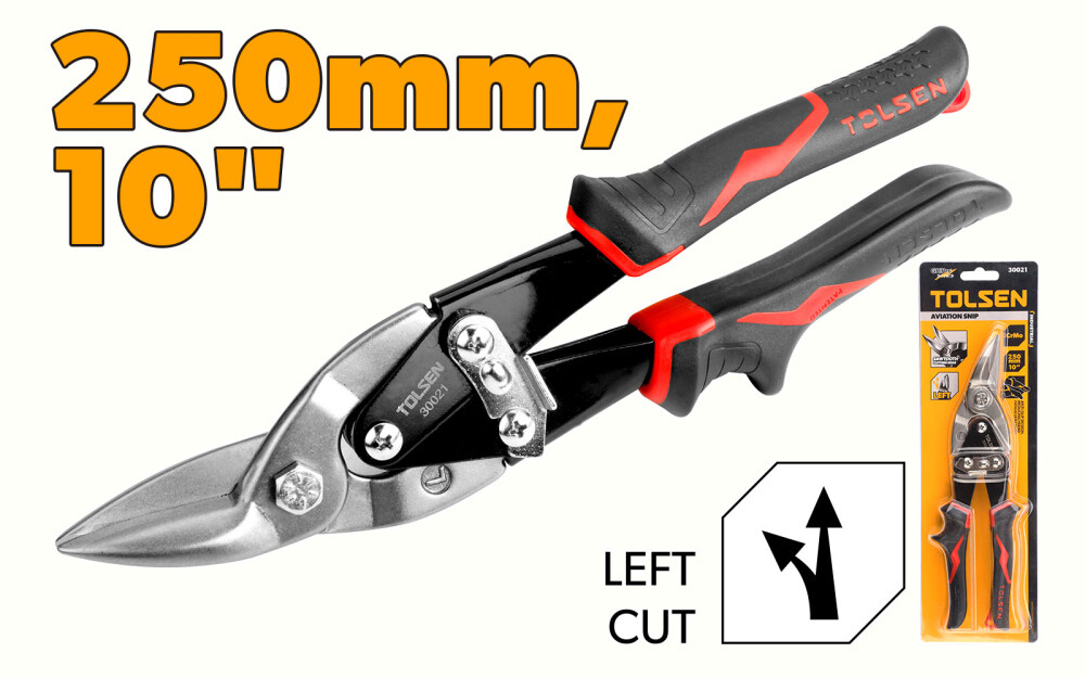 Această foarfecă de tablă Tolsen este concepută pentru a fi utilizată în tăierea precisă a materialelor plate, cum ar fi tabla și placa de metal. Este o foarfecă de tip aviator, cu o derivatie stânga, făcută din Cr-Mo (crom-molibden), care îi conferă o rezistență sporită la uzură. Cu o lungime de 10 "/ 250 mm, această foarfecă de tablă este ușor de manevrat și are un mâner din două componente pentru o prindere confortabilă și sigură. Ambalată într-un blister card, această foarfecă de tablă este ușor de utilizat și de depozitat în orice loc.