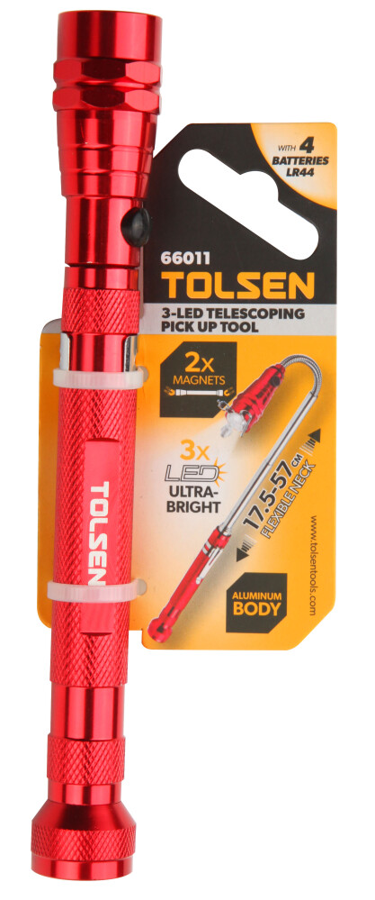 Aceasta unealta telescopica Tolsen are un gat flexibil cu o lungime reglabila intre 17,5 si 57 cm, oferind o flexibilitate suplimentara pentru a ajuta la pozitionarea obiectelor grele si voluminoase. Acesta unealta are un corp din aluminiu pentru a asigura o durabilitate indelungata si o greutate usoara pentru o manevrabilitate mai buna. Cu trei LED-uri ultra-luminoase si 2 magneti la capetele lanternei, aceasta unealta ofera iluminare suplimentara si o prindere sigura si stabila pentru obiectele grele.