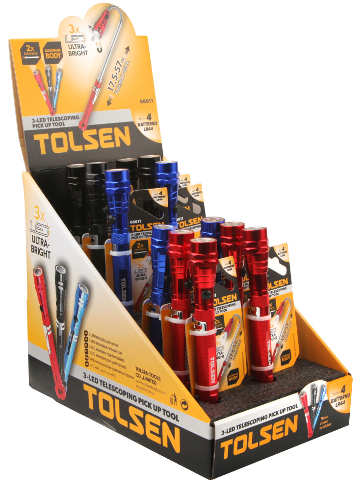 Aceasta unealta telescopica Tolsen functioneaza cu 4 baterii LR44 incluse, oferind o functionare continua si de lunga durata. Acesta unealta este disponibila in trei culori diferite pentru a se potrivi cu preferintele personale si nevoile specifice.