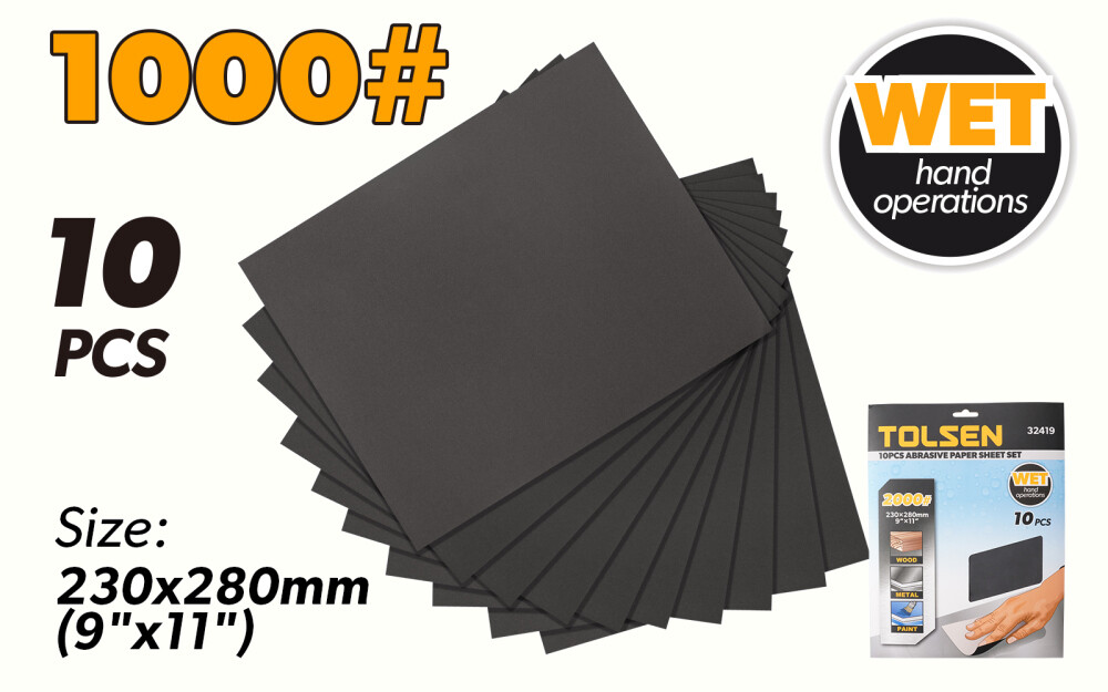 Set de foi de hartie abraziva 10buc, Granulatie P1000, 28x23 cm, pentru umed - Tolsen