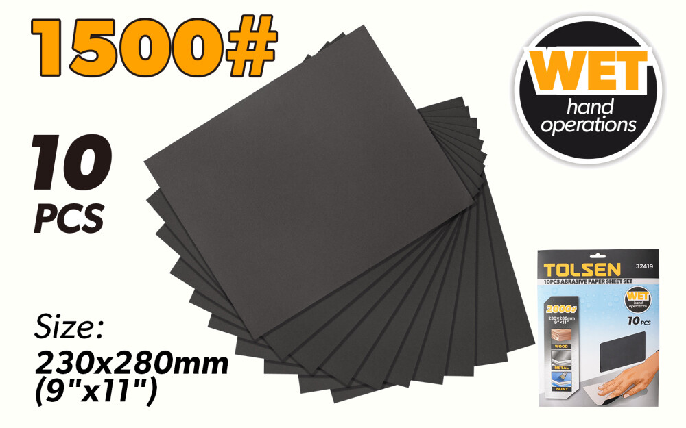 Set de foi de hartie abraziva 10buc, Granulatie P1500, 28x23 cm, pentru umed - Tolsen